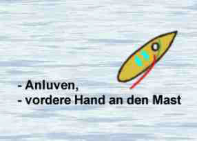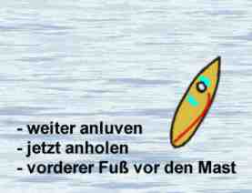 Wer sich erinnert, weiß, dass beim Anluven das Rigg in der Segelebene nach hinten geschoben wird. Bei der Wende solltest du beherzt anlufen. Um dich auf die folgenden Schritte auf dem Board vorzubereiten sollte deine vordere Hand schon an den Mast greifen. Das Surfboard dreht mit Fahrt zum Wind hin
