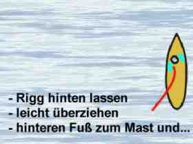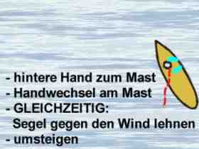 Die hintere Hand lässt nun den Gabelbaum los, wechselt mit der anderen Hand am Mast, während du gleichzeitig auf die neue Seite gehst, und das Rigg noch gegen den Wind lehnst. Sobald du deine Füsse versetzt hast.....