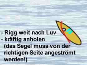 ...muss das Rigg nicht nur aufgerichtet, sondern am Mast eindeutig nach Luv (auf abfallen) geschoben werden und mit der anderen Hand am Gabelbaum kräftig angeholt werden. Sobald du auf dem neuen Bug Fahrt aufgenommen und wieder einen stabilen Am Wind Kurs erreicht hast, nimmst du die Hand vom Mast ebenfalls an die Gabel und hörst auf weiter abzufallen.