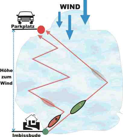 Wenn du also von der Imbissbude am See wieder zurück zu deinem Wagen willst, kannst du viele kleine Schläge surfen, und nicht ganz so hart am Wind.