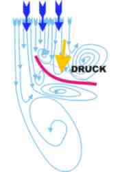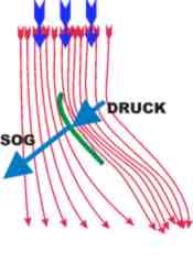 Auf der Luvseite des Segels entsteht Druck, auf der Leeseite entsteht Sog. (1/3 Druck 2/3 Sog). Beides addiert sich zur gesamten Kraft im Segel - mehr als nur der Winddruck - !!